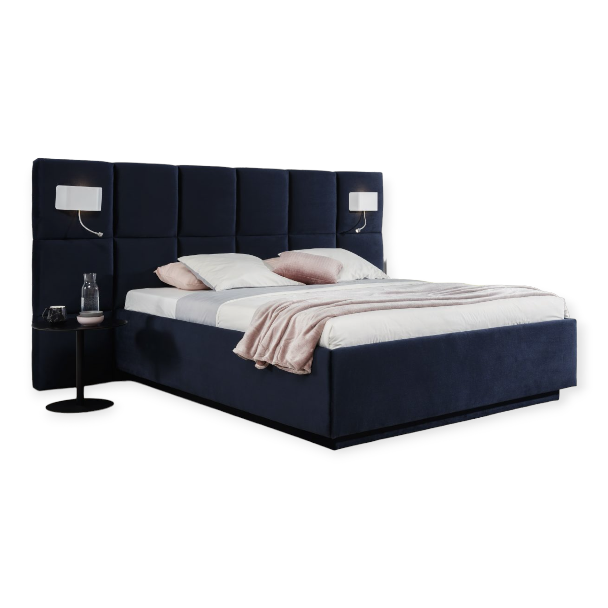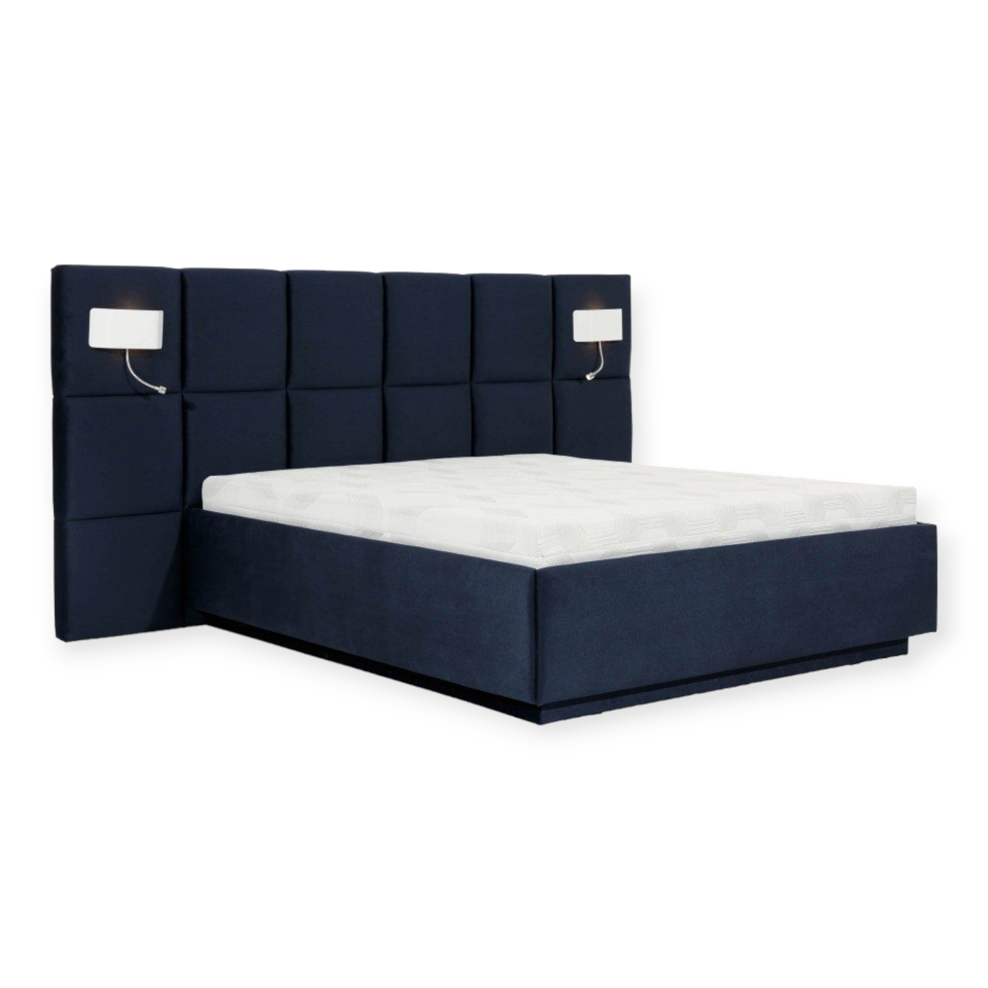 Proste wysokie wezgłowie przypominające tabliczkę czekolady. Łóżko inspirowane dużymi sypialniami, dlatego też wezgłowie jest poszerzone poza skrzynie łóżka.