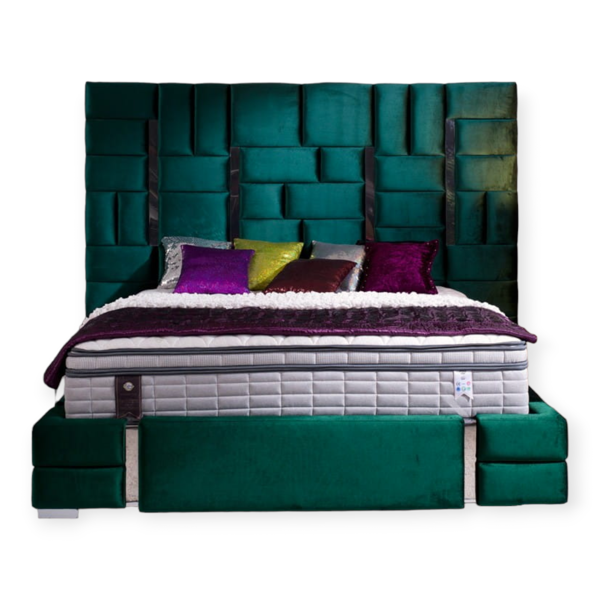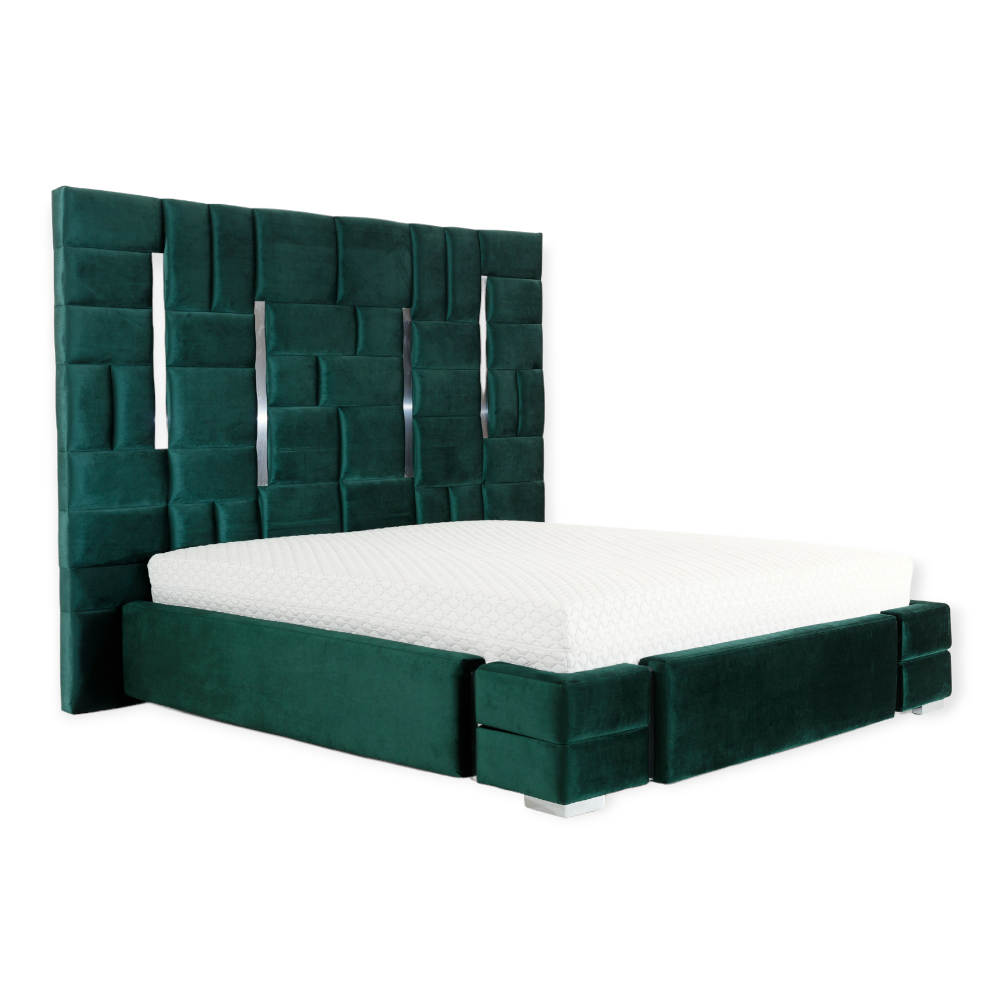 Masywne łóżko wykonane w kształcie nieregularnych prostokątów ze wstawkami ze stali nierdzewnej! Aby uwydatnić charakterystykę łóżka, wezgłowie ma aż 180 cm wysokości i jest wykonane w całości.