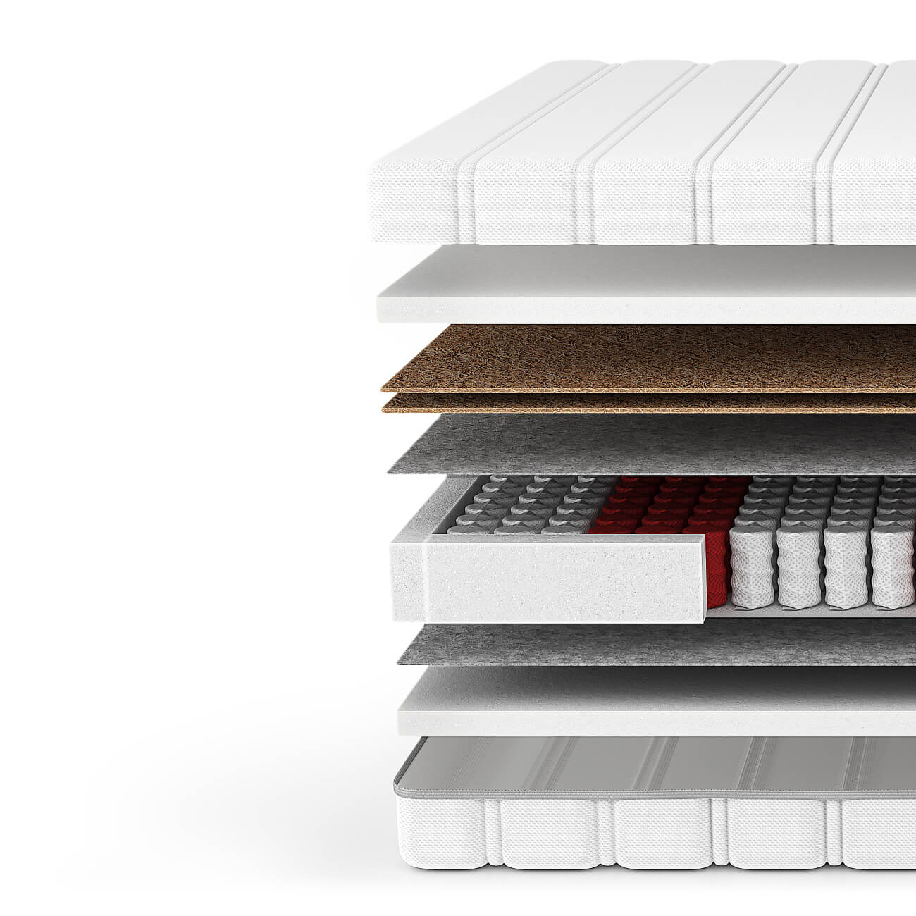 Wnętrze materaca tworzą sprężyny kieszeniowe, które pracują niezależnie od siebie i odpowiadają za 7 stref twardości – różne obszary materaca lepiej dopasowują się do kształtu ciała, zapewniając odpowiednie podparcie dla głowy, barków, lędźwi i nóg.